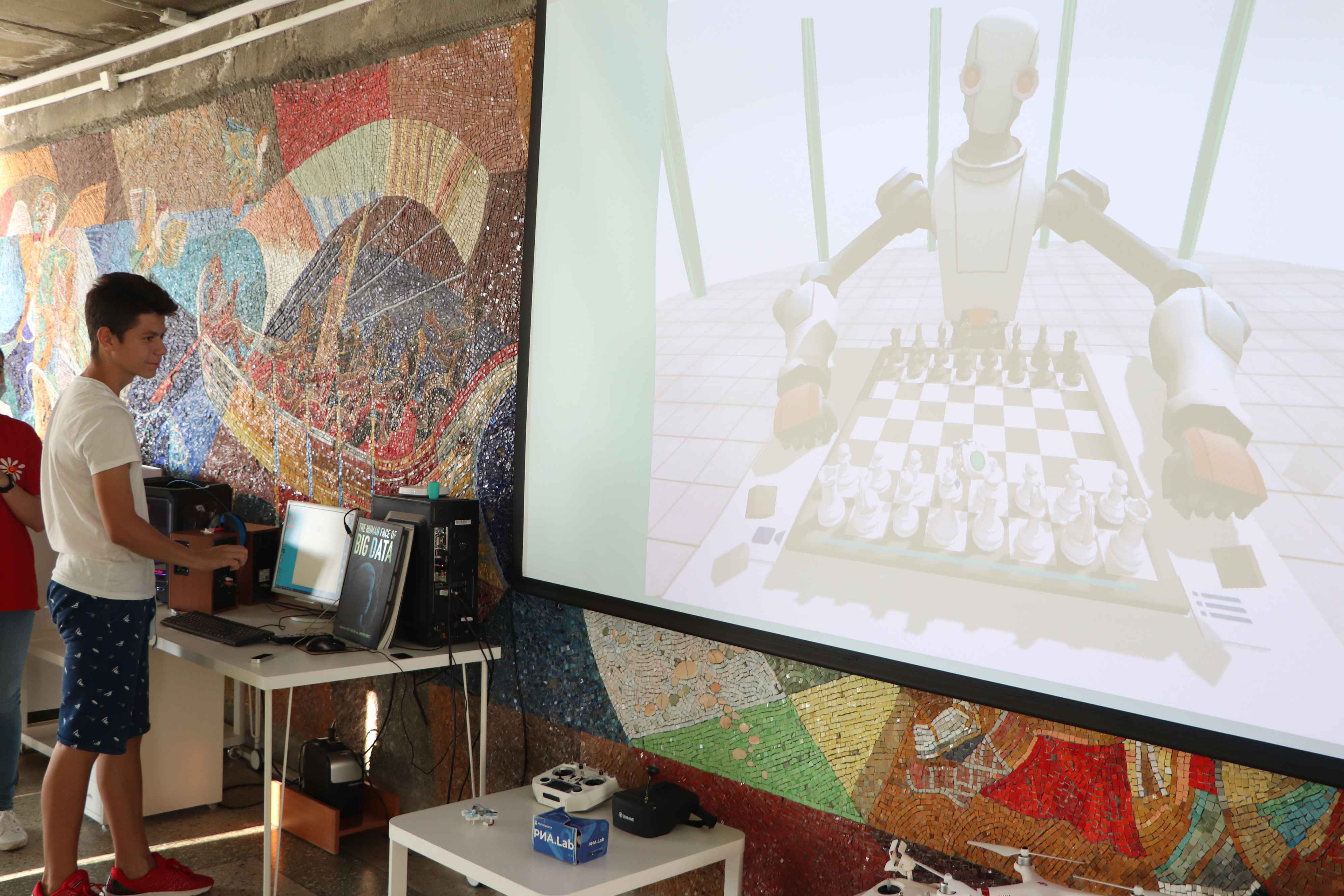 После занятий 7 и 8 отряды посетили SAP – центр инновационного развития, где им рассказали об этапах развития технологий, таких как нейросеть, виртуальная реальность и робототехника. Детям выпала уникальная возможность сыграть партию шахмат с искусственным интеллектом в виртуальной реальности.